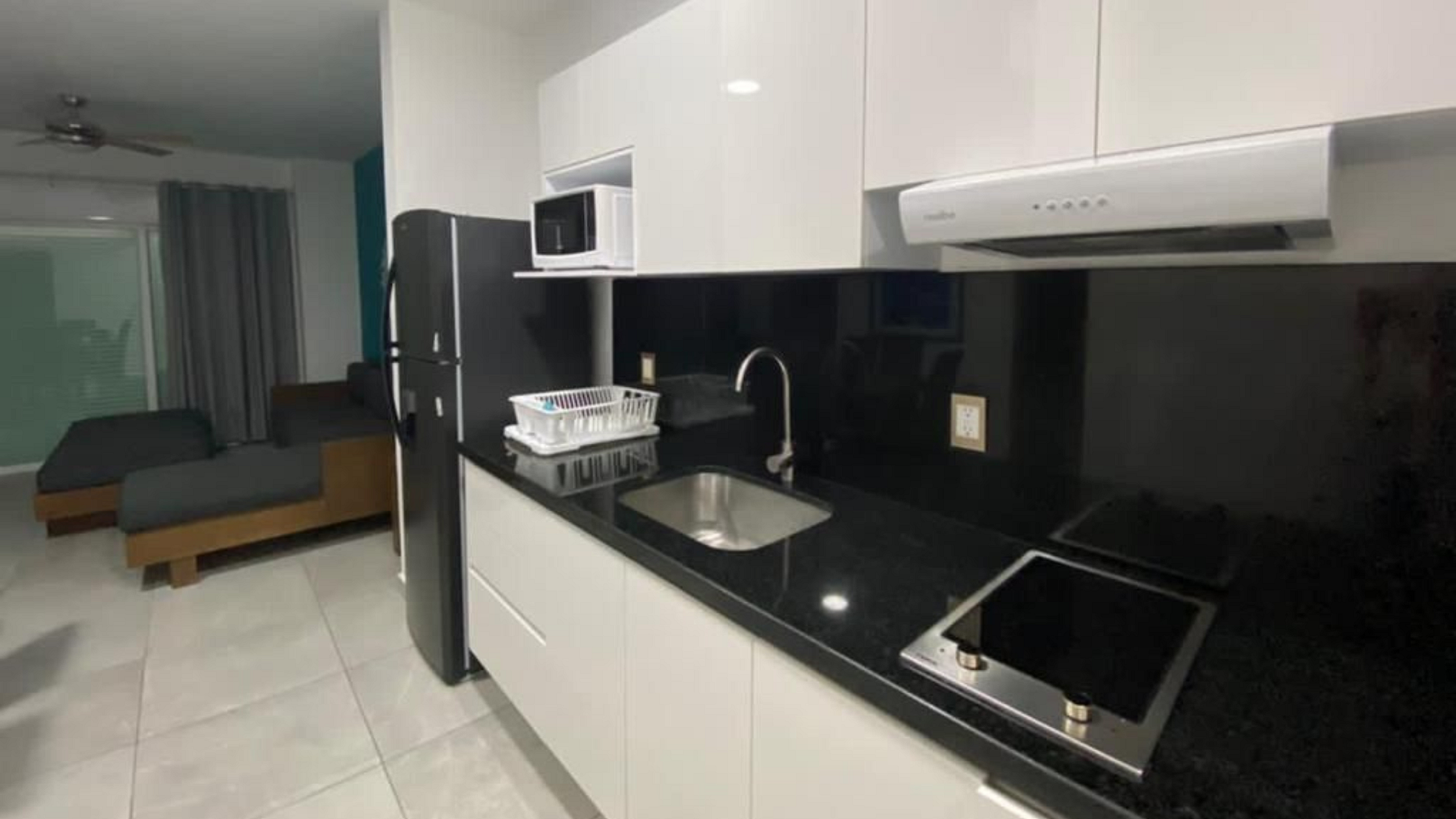 Cocina totalmente equipada con: Refrigerador. Estufa de 2 quemadores. Campana. Microondas. Licuadora. Utensilios de cocina. Cafetera.