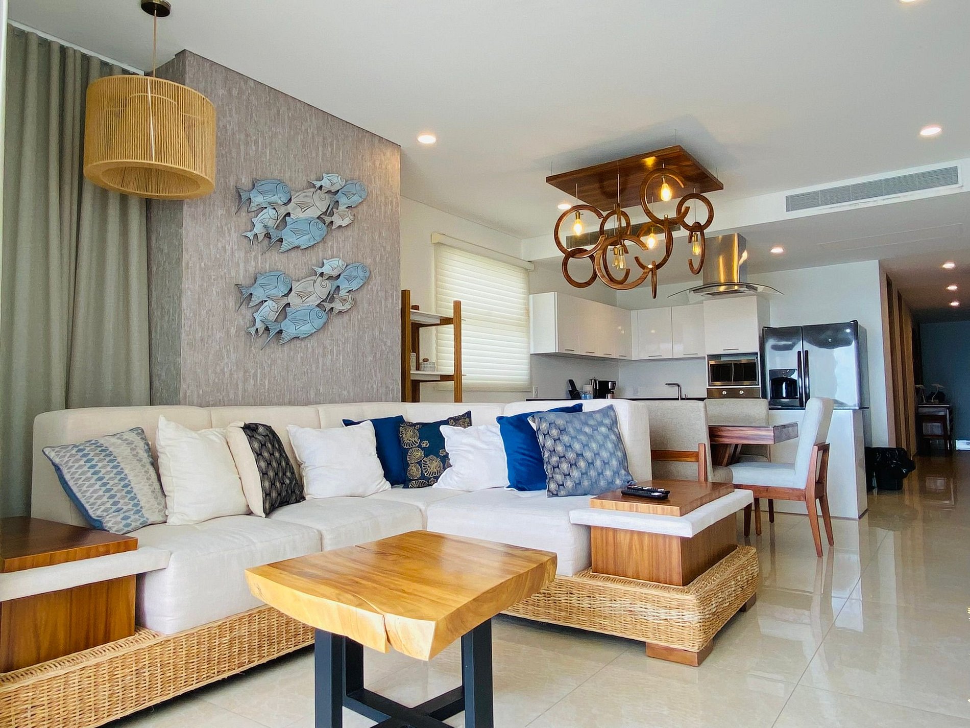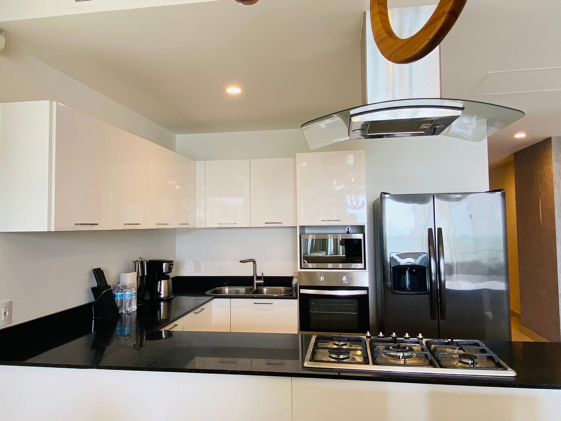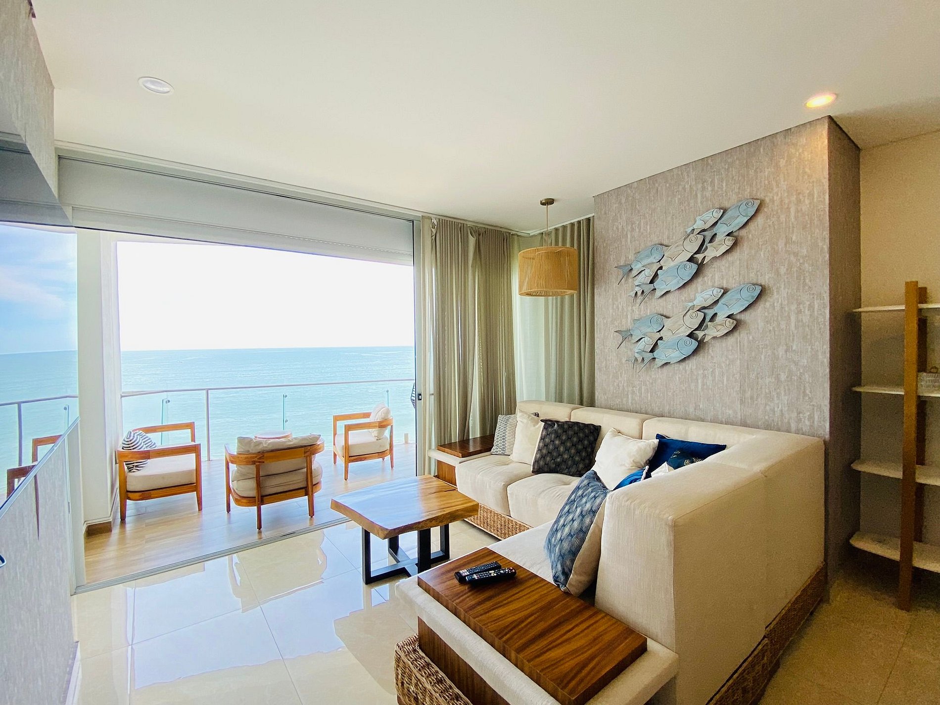 Cocina con: refrigerador, estufa de 5 quemadores, campana, microhondas, licuadora, cafetera, utensilios de cocina.Terraza con vista al mar con sala.