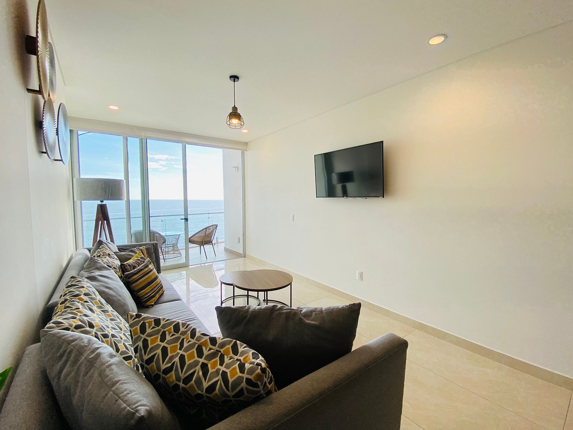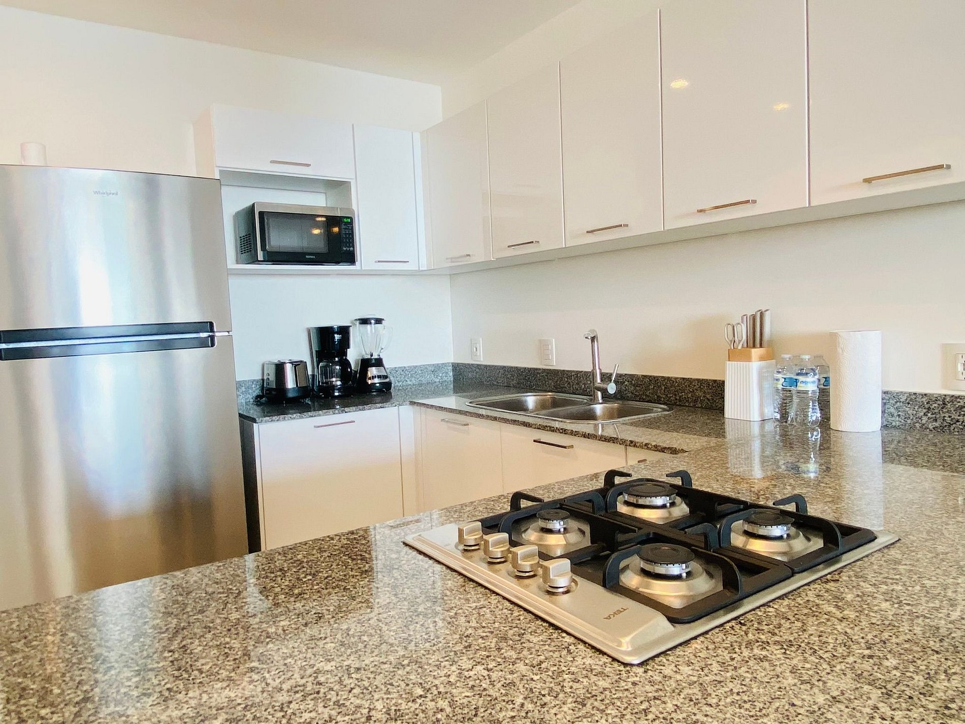 Cocina con: refrigerador, estufa de 4 quemadores, campana, microhondas, licuadora, cafetera, utensilios de cocina.Terraza con vista al mar con sala.