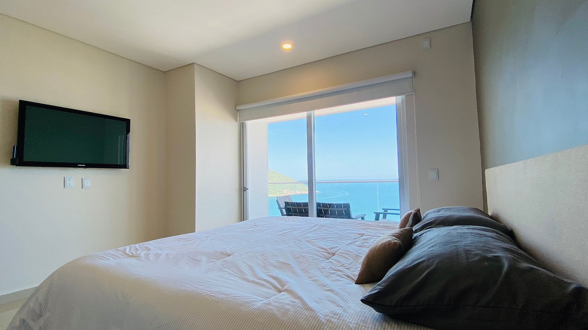 Recámara principal: 1 cama King Size, TV, closets, baño completo y balcón con vista al mar.