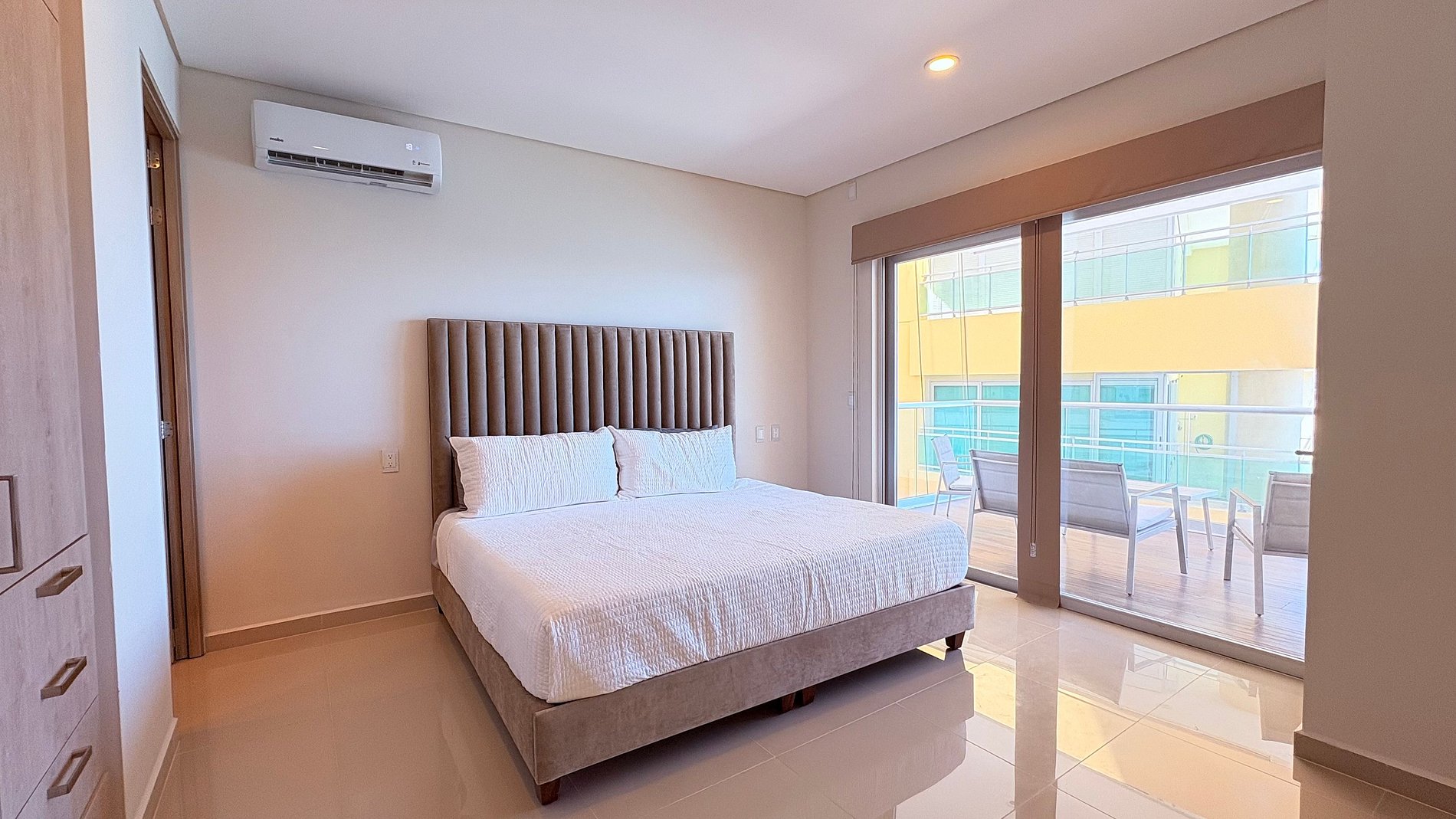 La recámara principal cuenta con cama king, clósets, baño y acceso directo a la terraza. La segunda recámara tiene dos camas matrimoniales. Ambas habitaciones tienen aire acondicionado.