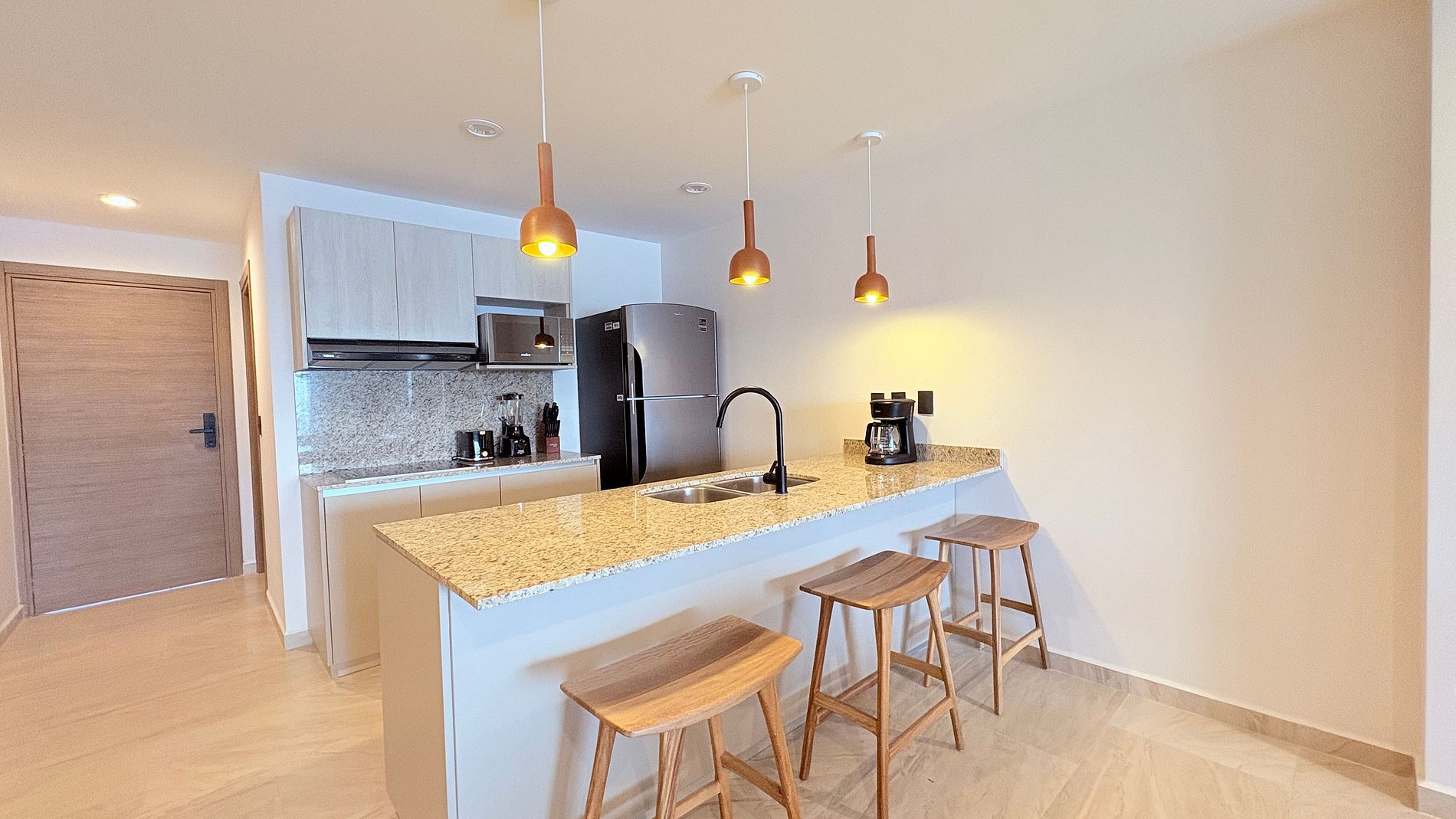 La cocina está totalmente equipada con electrodomésticos esenciales: refrigerador, parrilla, microondas, licuadora, cafetera y tostador. También encontrarás un comedor para 6 personas, barra con bancos y una sala acogedora con Smart TV de 75”. Además, el departamento cuenta con centro de lavado, aire acondicionado en todas las áreas y WiFi de alta velocidad.
